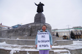 На площади 1905 года в Екатеринбурге вышла на пикет одна из горожанок, протестующая против вырубки в жилом районе Широкая Речка так называемого круглого леса.
