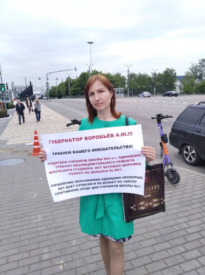 «Родители учеников школы №5 в г. Одинцово требуют незамедлительного ремонта школьного стадиона. Нет беговых дорожек. Ремонт не делался 50 лет. Управление образования Одинцово несколько лет даёт отписки…» — гласил её плакат.